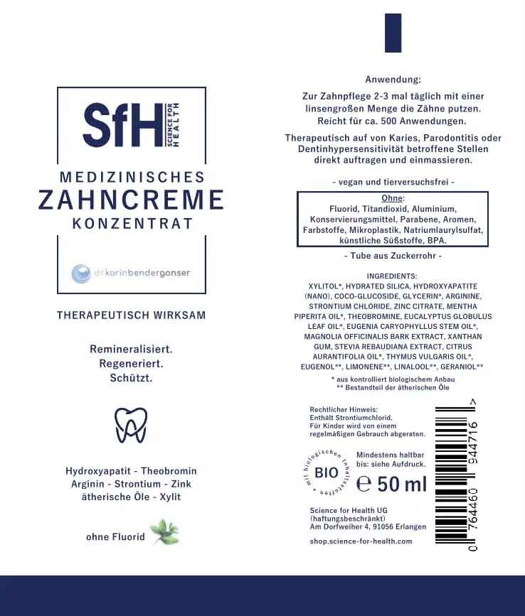 Es handelt sich um ein Konzentrat. Zur Zahnpflege 2-3 mal täglich mit einer linsengroßen Menge die Zähne putzen. Die Tube von 50 g reicht für ca. 500 Anwendungen. Für die therapeutische Anwendung medizinisches Zahncreme-Konzentrat auf von Karies bzw. Parodontitis betroffene Stellen oder schmerzempfindliche Zähne direkt auftragen und einmassieren.